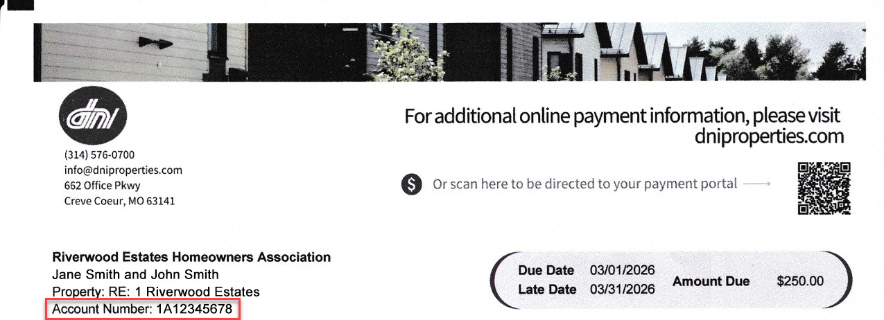 Before paying your HOA dues for Riverwood Estates, you will need your DNI Properties account number. This can be found on your annual bill that is sent via postal service. When you have your Account Number, proceed to Step 2.